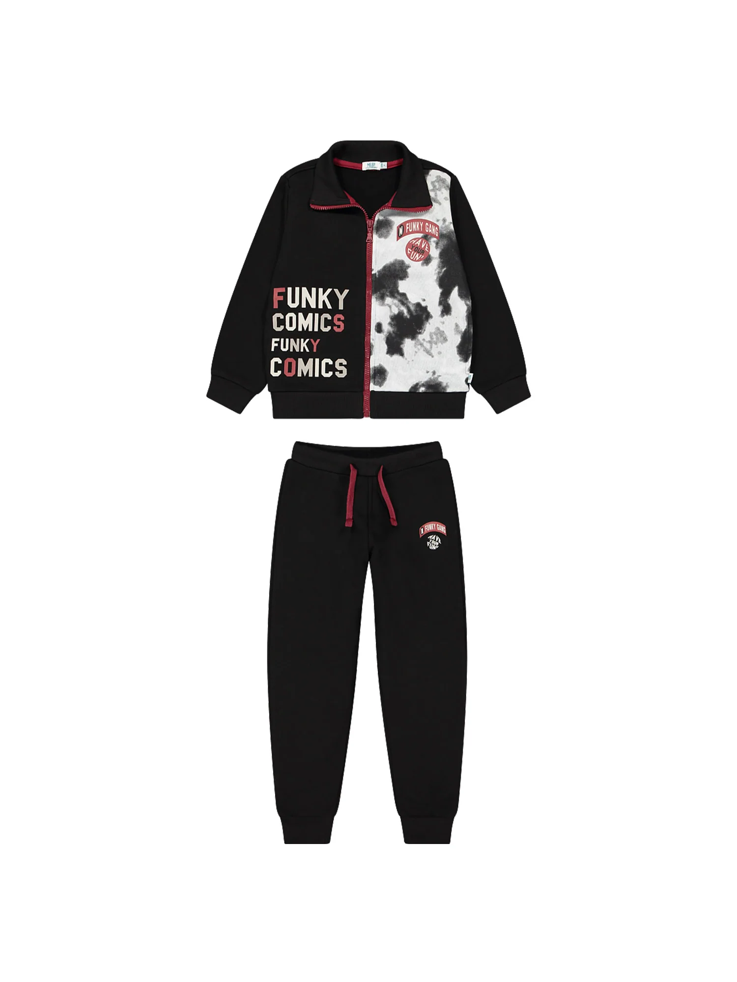 Felpa con cerniera e pantalone con elastico in vita regolabile con laccetti.